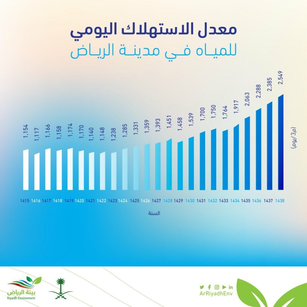 يُلاحظ في هذا الرسم إرتفاع كمية إستهلاك الماء في مدينة الرياض كل عام أكثر من الذي قبله . ومن الممكن أن تكون هذه الزيادة بسبب زيادة عدد السكان في مدينة الرياض او الزائرين لها نظرًا لأنها عاصمة المملكة العربية السعودية .