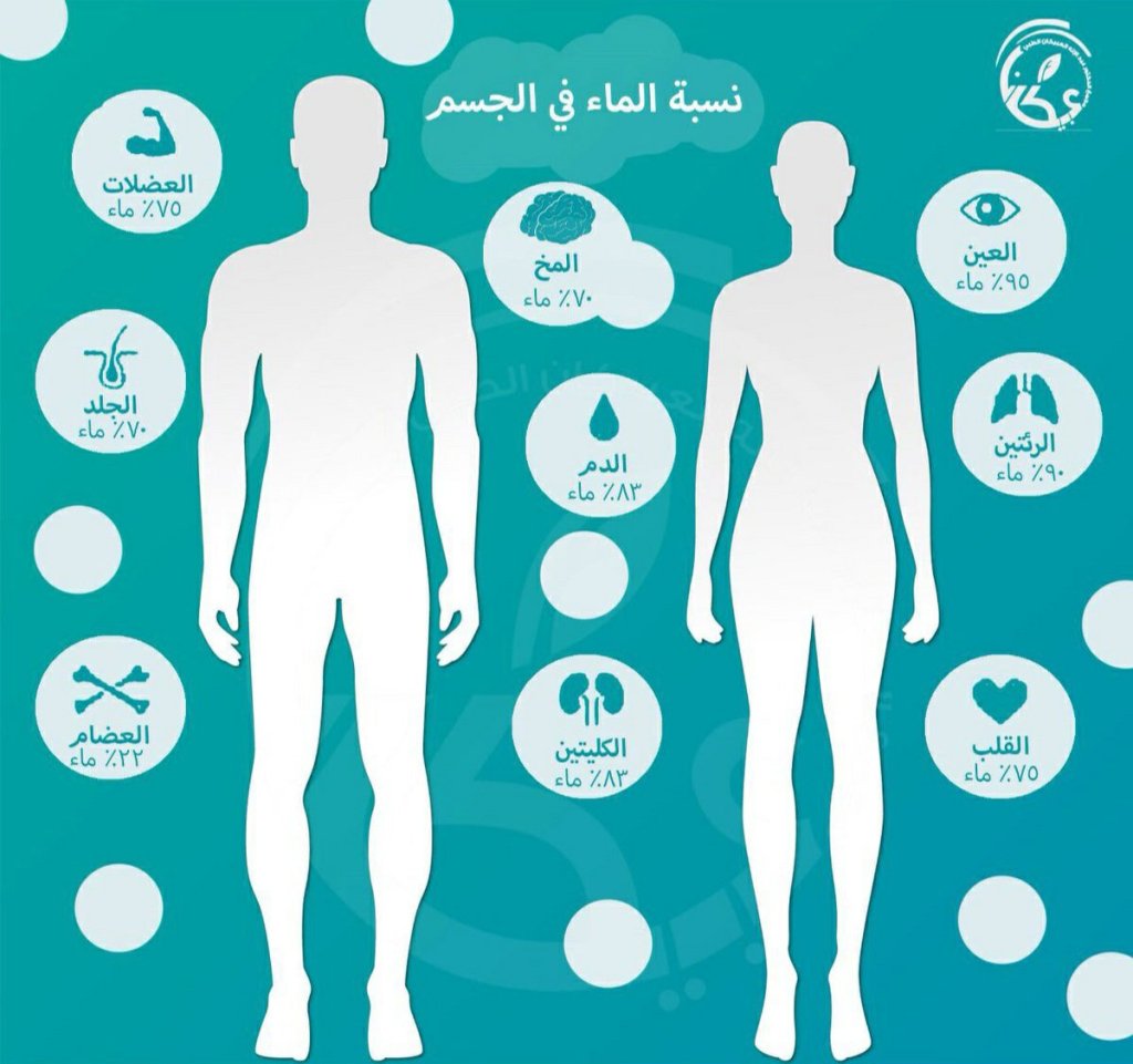 يعتبر الماء المكون الأساسي لجسم الانسان وشكل حوالي 50% الى 70% من وزنك ،كما يقوم بتنظيم درجة حرارة الجسم وتذويب المعادن والمواد الغذائية المختلفة في الجسم . كما يُعتبر مادة أساسية في تكوين الدم والسائل اللمفاوي وطرح السموم خارج الجسم .
